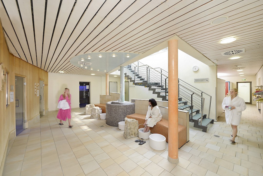 Verschiedene Saunen, ein vielfältiges Aufgussprogramm, ein Dampfbad, mehrere Ruheräume und ein Trinkbrunnen sorgen auf einer Fläche von 850 m² für Erholung und Wellness.
